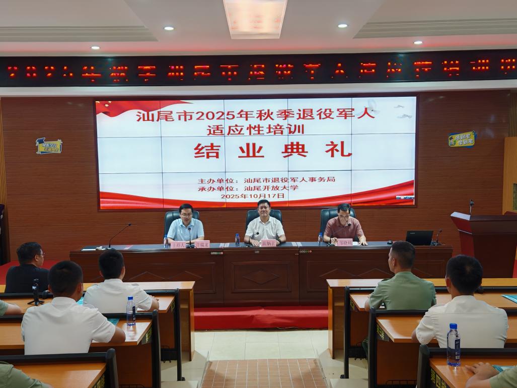 10月14日至20日,由汕尾市退役軍人事務(wù)局主辦、汕尾開(kāi)放大學(xué)承辦的2025年秋季汕尾市退役軍人適應(yīng)性培訓(xùn)班成功舉辦。培訓(xùn)期間,汕尾開(kāi)放大學(xué)黨委書(shū)記、校長(zhǎng)陳炳玄,市退役軍人事務(wù)局黨組成員、副局長(zhǎng)鄒曉科,汕尾開(kāi)放大學(xué)黨委委員、副校長(zhǎng)許瑞龍,市退役軍人事務(wù)局四級(jí)調(diào)研員方建河出席有關(guān)活動(dòng)。本次培訓(xùn)旨在幫助退役軍人順利完成角色轉(zhuǎn)換,提升就業(yè)創(chuàng)業(yè)能力,124人參訓(xùn)。