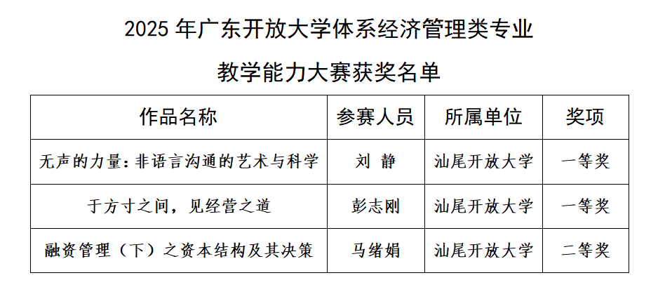 2025年11月24日,廣東開放大學(xué)公布了2025年度體系內(nèi)經(jīng)濟(jì)管理類專業(yè)教學(xué)能力大賽評選結(jié)果,我校三項(xiàng)參賽作品表現(xiàn)突出,喜獲榮譽(yù)。劉靜老師的《無聲的力量:非語言溝通的藝術(shù)與科學(xué)》與彭志剛老師的《于方寸之間,見經(jīng)營之道》雙雙榮獲一等獎(jiǎng);馬緒娟老師的《融資管理(下)之資本結(jié)構(gòu)及其決策》獲得二等獎(jiǎng)。